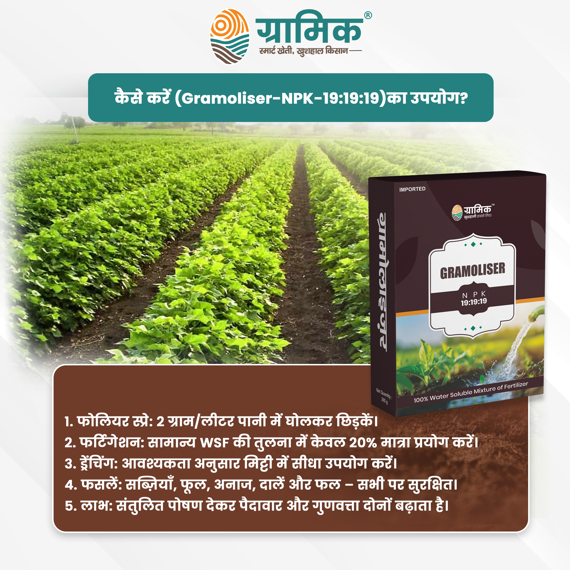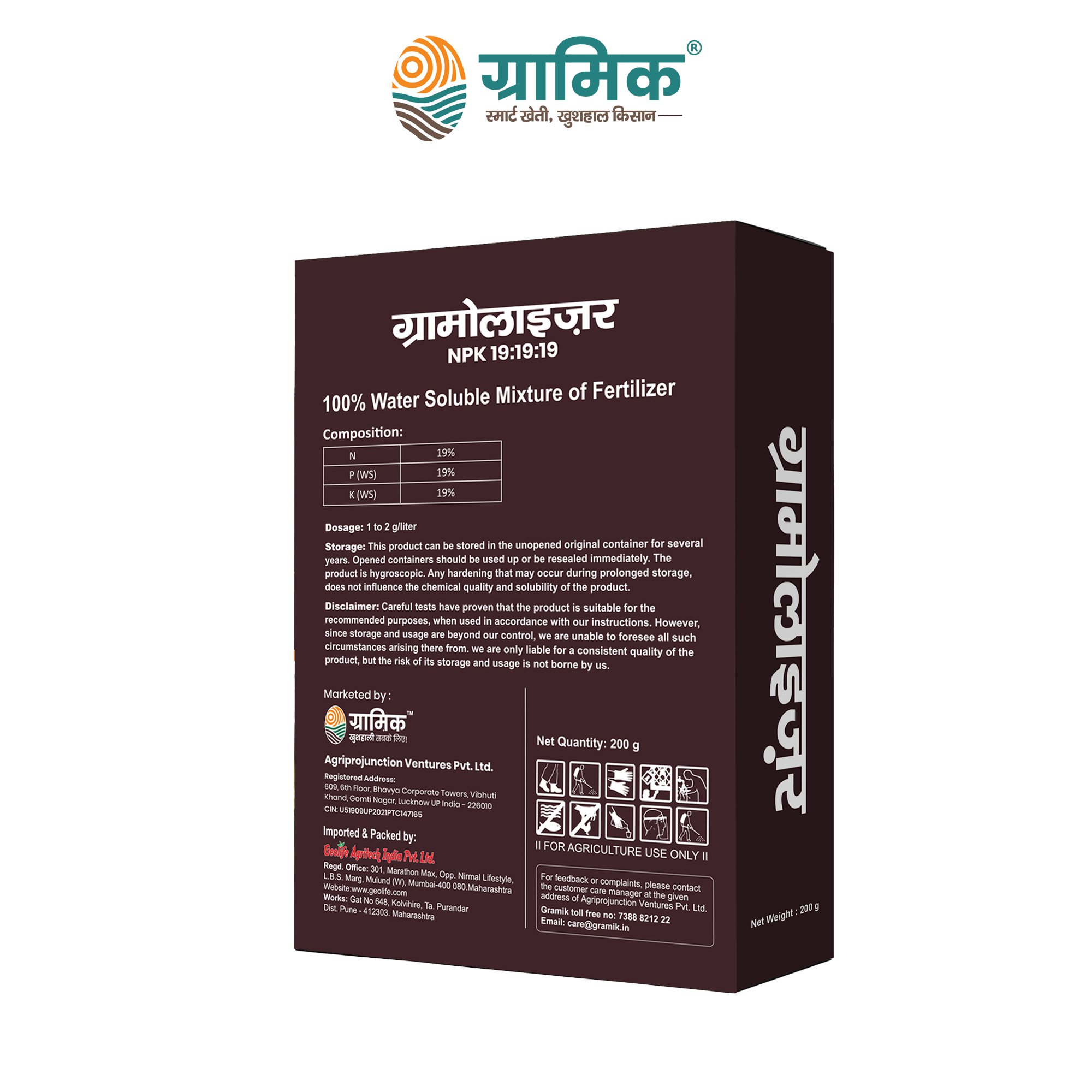 A fully water-soluble fertilizer containing three essential nutrients — Nitrogen (N), Phosphorus (P), and Potash (K). It provides balanced nutrition to plants and helps farmers improve yield and profitability.