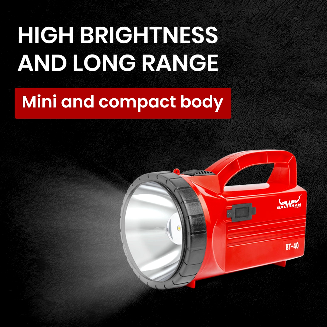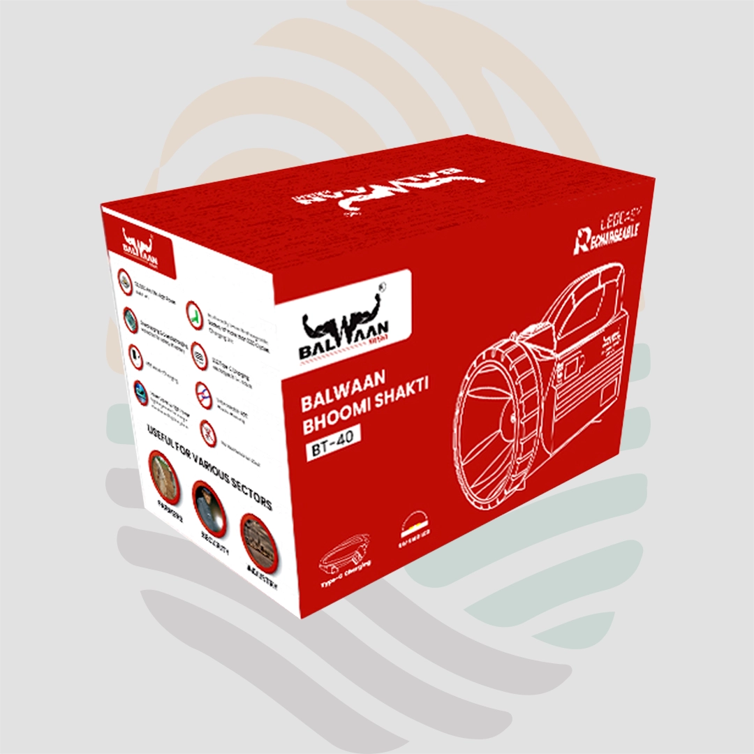 Balwaan Bhoomi Shakti Torch, BT-40 is a handheld device that produces light using batteries as its power source. It has a bulb, a reflector, and a battery compartment. When turned on, the bulb lights up and provides a beam of light. The torch's body is made of ABS Plastic, and it has additional features such as shock resistance, USB mobile charging, and multiple light modes. It's a reliable and convenient source of light for outdoor activities such as Agriculture, housing, industrial, construction, emergencies, and power outages.