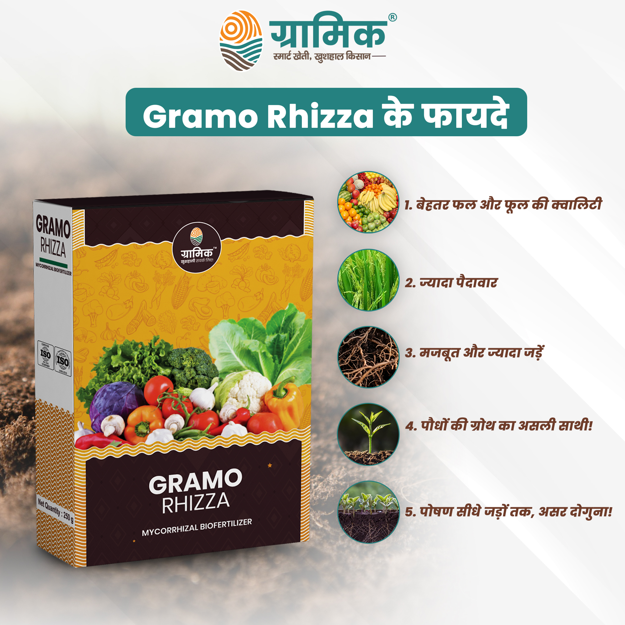 Gramo Rhizza forms a symbiotic relationship with plant roots and develops a secondary root system (hyphae), which increases the root surface area, allowing plants to access nutrients from a larger volume of soil.