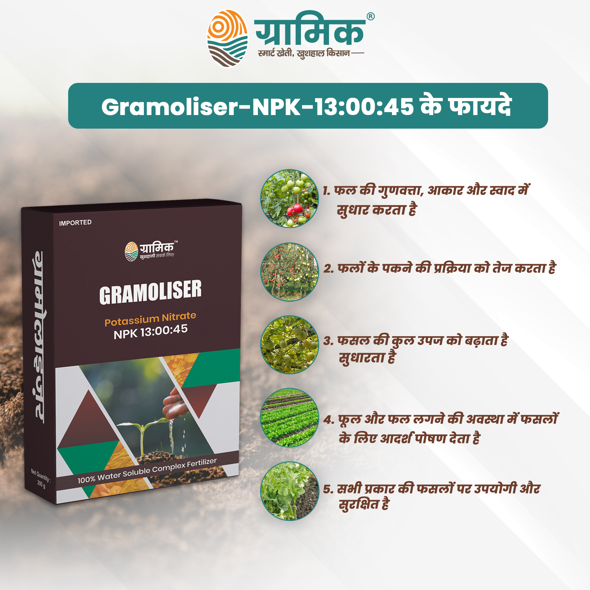 13:00:45 is a general purpose formula with a balanced nutrient ratio for all Crops.